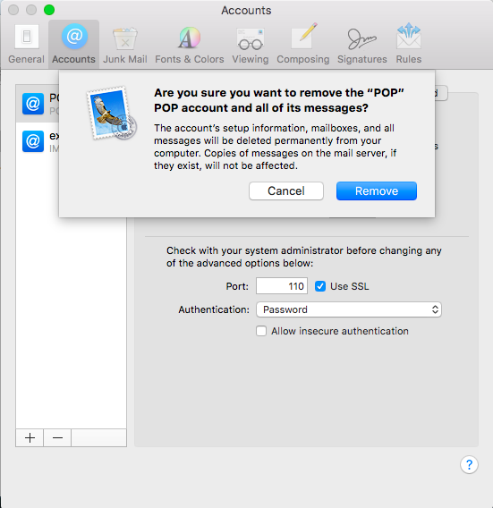 - Now that the IMAP Account is the default account, remove the old POP account by selecting it, and then clicking Remove along the top bar.