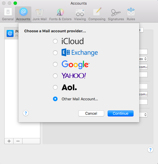 - Click the + button to begin adding a new account, and select Other Mail Account for the account type.