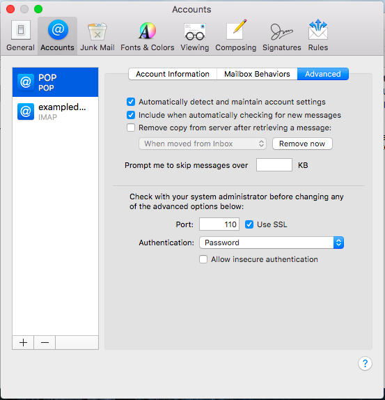 - Click back on the POP account, and go back into the Advanced tab. Disable the account from removing copies of mail from the server by unchecking Remove copy from server after retrieving a message. Once done, close out of Accounts.