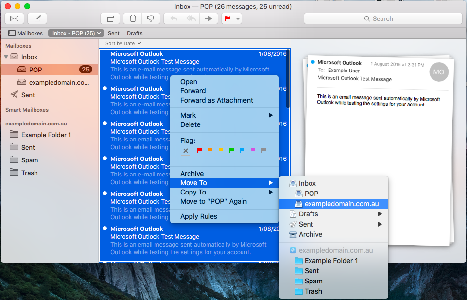 - Select all items of mail by pressing Command-A, then proceed to right-click on the group. Highlight over Move To and proceed to move them to the new mailbox, generally being the lowest one on the list. Allow time for this step. Depending on both your computer speed and your internet speed, this may take a while.