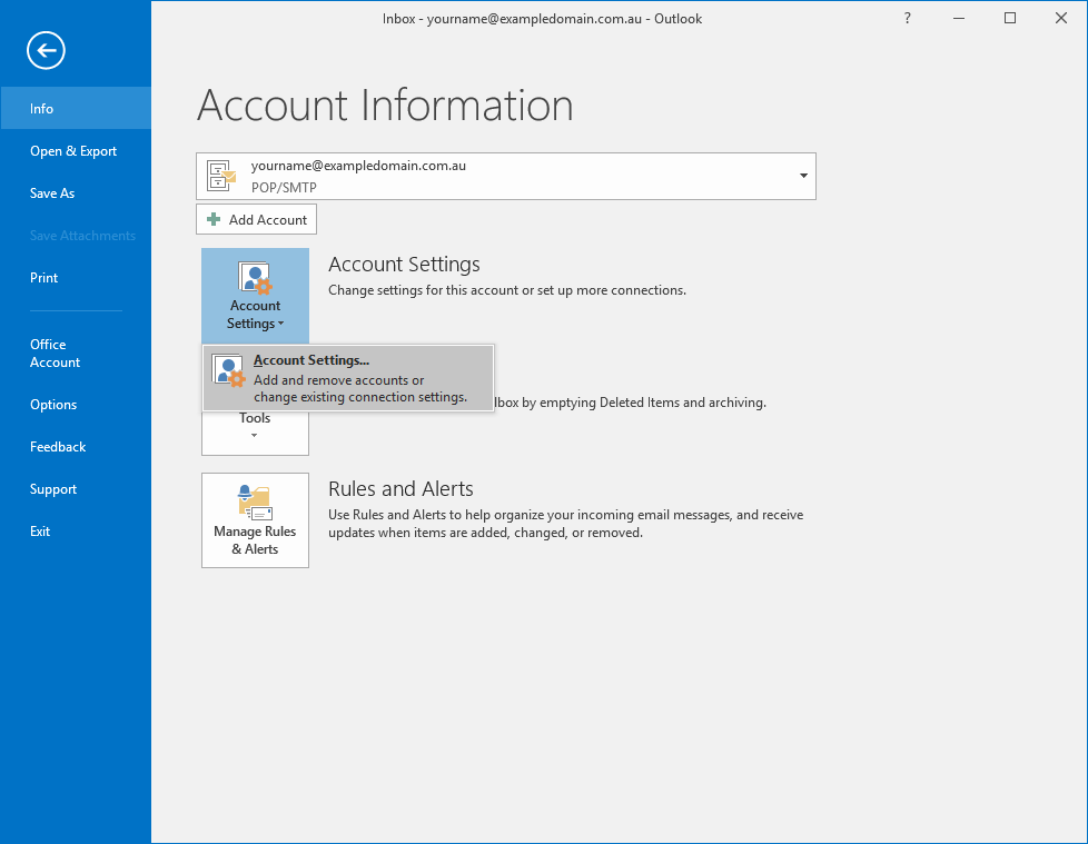 - Close out of Outlook completely and reopen it. Proceed back to Account Settings.