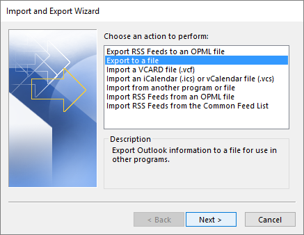- The Import/Export Wizard will open, select Export to a file and click Next.
