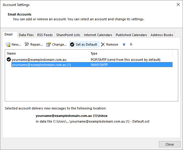 - Set the new IMAP account as the default by clicking on it, and then pressing Set as Default along the top bar.