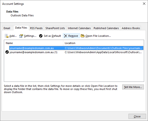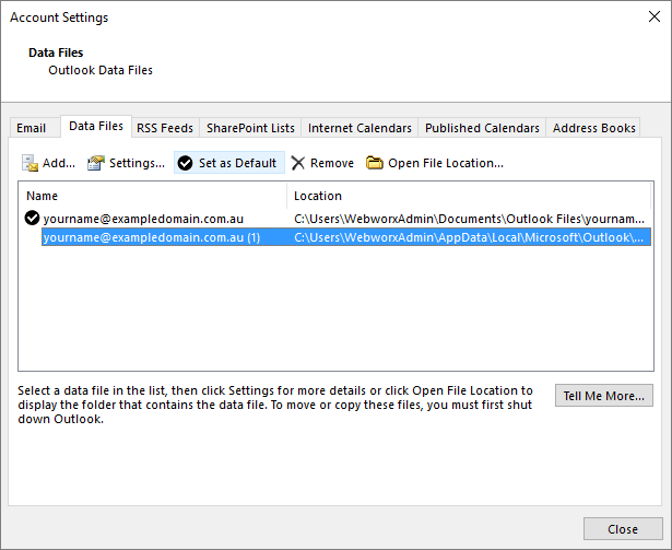 - Open the Data Files tab and select the new data file; generally having the suffix of (1), and set it as default.