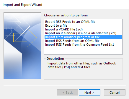 - The Import and Export Wizard will open again. This time, select Import from another program or file.