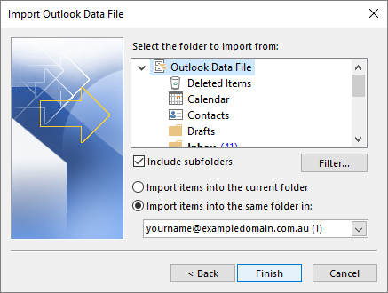 - Select Import items into the same folder in..., ensuring that Include subfolders is selected. Click Finish.