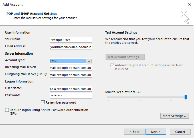 - Select IMAP under Account Type and fill out the incoming/outgoing mail server option, replacing exampledomain.com.au with your own domain name. Ensure that your username under the Logon Information subheading has the domain name at the end. When this is all filled out, click More Settings.