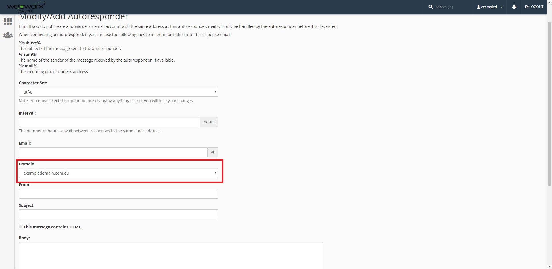 6. The Domain is set default to 'exampledomain.com.au'. This will be your email used for your domain account, in which case it will be different. Change this if needed.