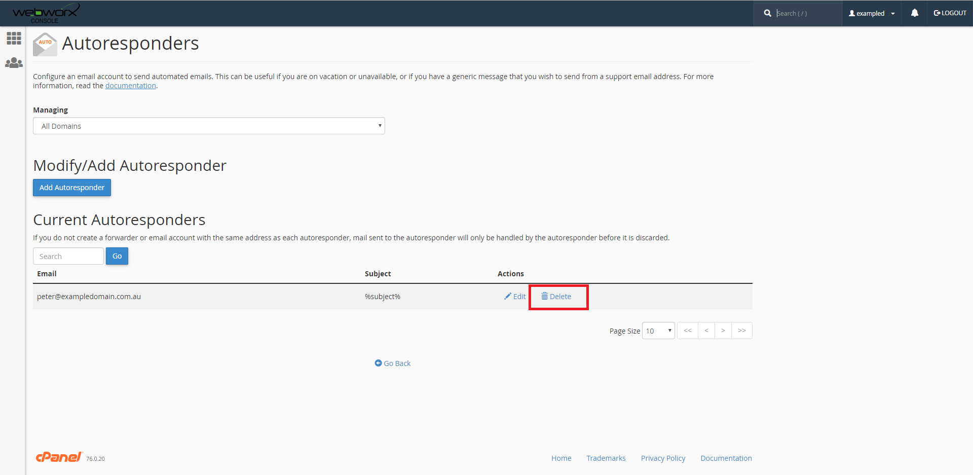 10.The autoresponder will continue to do its job until its STOP date has come, or its been manually removed. Reasons for removing might be, Change of plans, holiday was cancelled. Delete the autoresponder by clicking on delete as highlighted below.