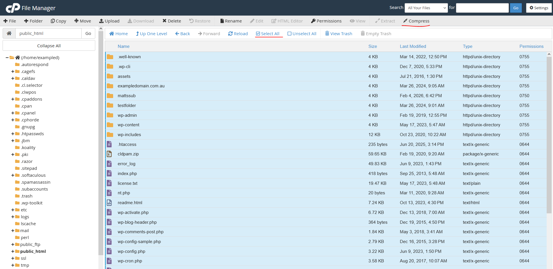 d. Select all files and folders. Click Compress in the top toolbar. (Deselect any subdirectories and files that aren't part of the Website)
