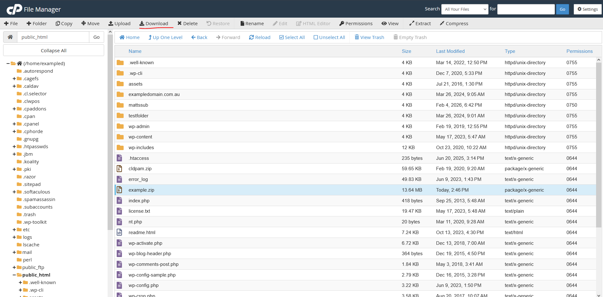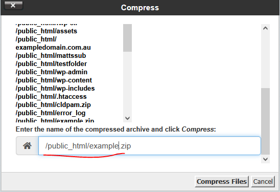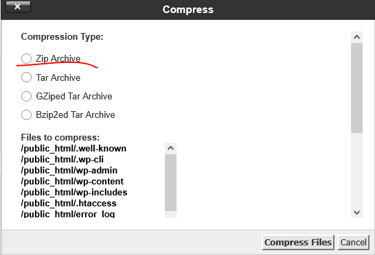 e. Choose Zip Archive and name the file (e.g., wp_files_backup_Feb_2026.zip) and click Compress Files.