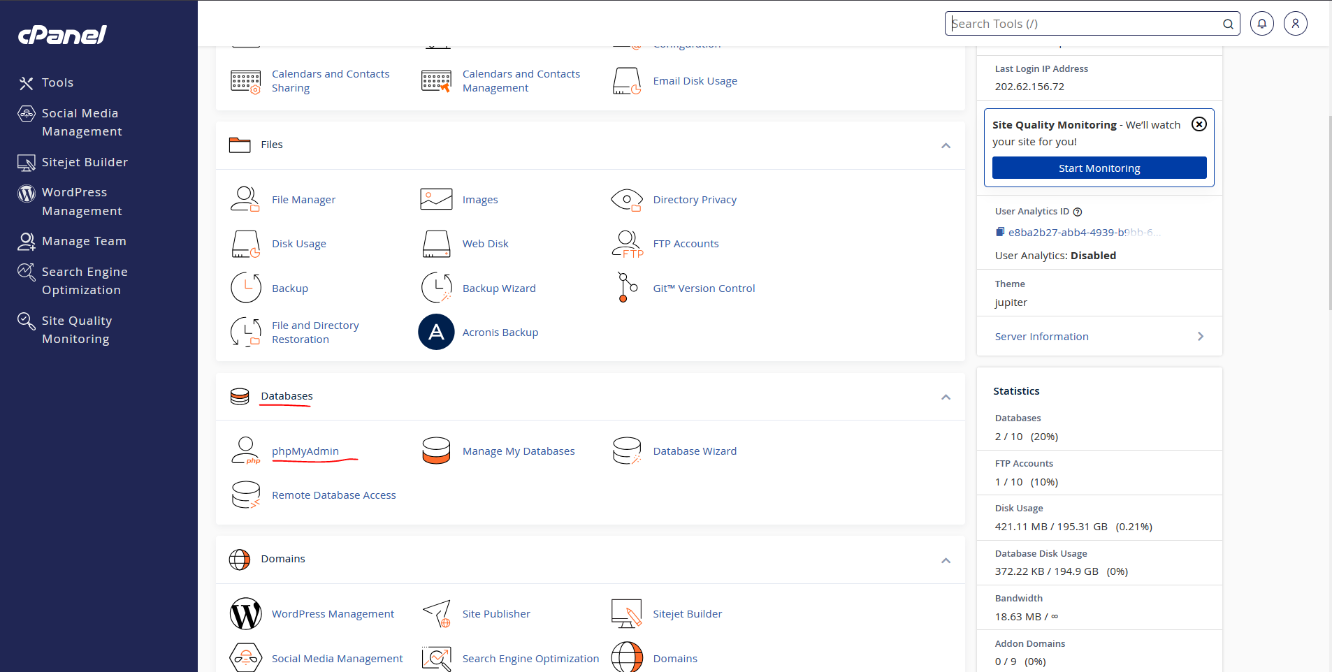 a. Return to the cPanel home screen and find the Databases section, click on phpMyAdmin.